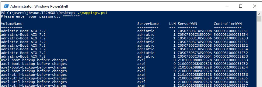 # $report | sort VolumeName,ServerName,LUN | select VolumeName,ServerName,LUN,ServerWWN,ControllerWWN | Export-Csv "c:\temp\mappings.txt"